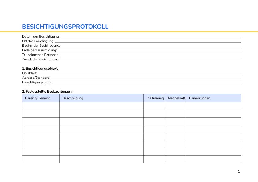 Das Besichtigungsprotokoll ist ein wesentliches Dokument zur systematischen Erfassung und Dokumentation von Beobachtungen, Mängeln und Maßnahmen während einer Besichtigung. Es wird häufig in Bereichen wie der Immobilienbewertung, dem Bauwesen, der Qualitätskontrolle und anderen technischen Inspektionen eingesetzt. Das Protokoll enthält essenzielle Informationen wie den Zweck der Besichtigung, den Besichtigungsort, die teilnehmenden Personen sowie festgestellte Beobachtungen und Mängel.