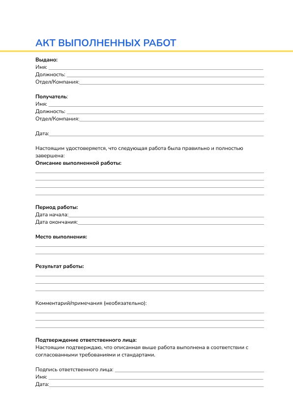 Акт выполненных работ — это официальный документ, который подтверждает выполнение определенного объема работы или оказание услуги. Он играет ключевую роль в процессах документооборота, особенно в сфере строительства, ремонта, а также в других областях, где необходимо зафиксировать факт выполнения обязательств. Этот документ является основой для расчета и оформления оплаты за выполненные работы. В акте выполненных работ указываются подробности о типе выполненной работы, её объемах и сроках исполнения.