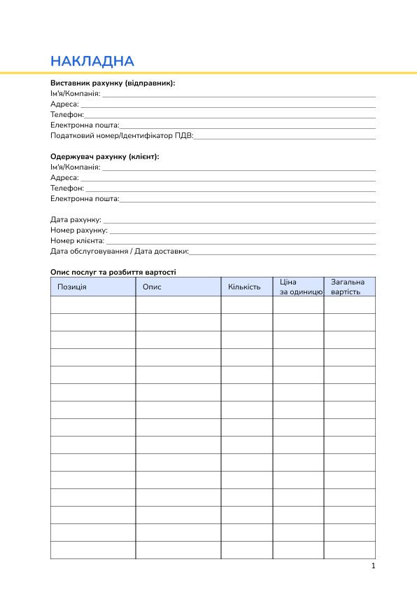 Накладна — це важливий офіційний документ, який використовується для обліку товарів, матеріалів або послуг під час їх передачі від постачальника до покупця або в межах підприємства. Вона є невід’ємною частиною товарообігу і служить доказом факту передачі та отримання товару. Накладна містить інформацію про найменування товару, його кількість, одиницю виміру, ціну, суму та умови поставки.